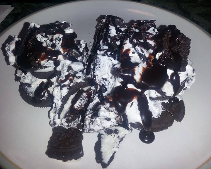 In a Pyrex lasagna dish, place a row of Oreo cookies on the bottom. In a glass bowl, roughly crush about 2 rows of Oreo’s and fold into the Cool Whip.
