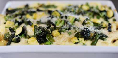 Butter a 9x13-inch baking dish. Add half the pasta, then spread 1/3 cup of the ricotta mixture over the surface. Sprinkle 1/3 of the Parmesan over the ricotta, then 1/2 of the vegetables. Repeat with the rest of the pasta, the rest of the ricotta, and another 1/3 of the Parmesan. End with the rest of the vegetables and the rest of the Parmesan.