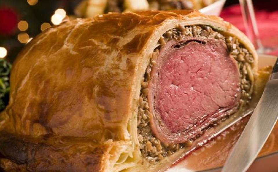 6. Roll out the puff pastry quite thinly to a size which will cover your beef, use a rolling pin to help flatten pastry. Unwrap the meat from the plastic wrap and place atop the pastry, in the middle. Egg wash: lightly beating an egg and brush it onto the pastry. Roll up the pastry, cut any excess off the ends and fold neatly to the 'underside'. Turnover and egg wash over the top and scar with a knife. Chill again to let the pastry cool, approximately 5 minutes. Egg wash again before baking at 200c for 35 - 40 minutes. Rest 8 -10 minutes before slicing.