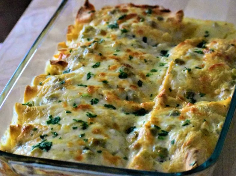 Assemble enchiladas by placing a large scoop of chicken filling into the centre of each Tortilla. Tuck in the ends and rool up each Tortilla, placing each one in the pan until full. Pour Chili Verde sauce over the top of the enchiladas and sprinkle mozzarella over the top.