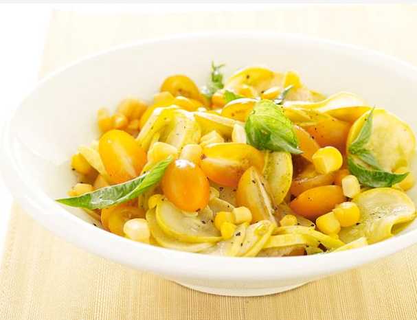 31. Yellow Trio: Cut the kernels off an ear of corn; sauté in olive oil with yellow squash slices. Toss with yellow grape tomatoes, basil, salt and pepper.