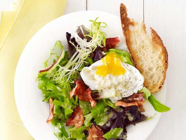 39. Bistro Bacon Salad: Chop and fry bacon; combine the drippings with cider vinegar, dijon mustard, olive oil, salt and pepper. Toss with mesclun greens; top with the bacon and a poached egg.